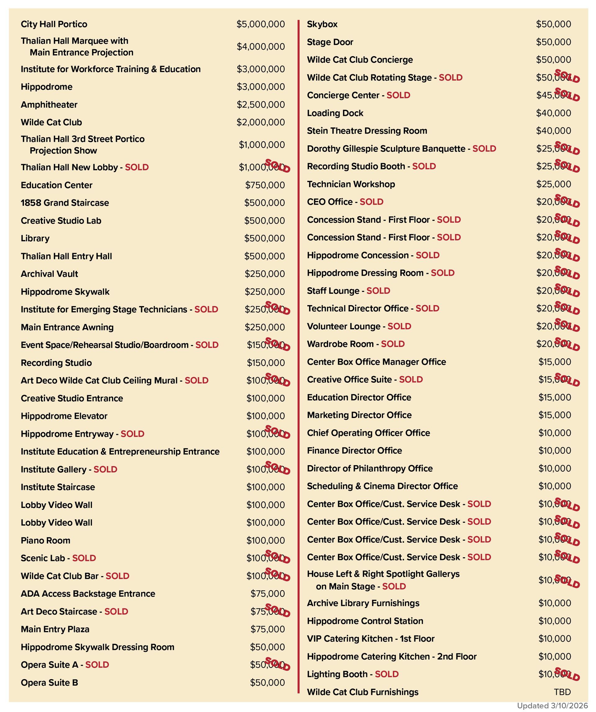 Thalian Hall is pleased to offer many naming opportunities to those interested in pledging their support to this campaign! With a wide range of financial pledges available, these naming opportunities provide you the chance to create a lasting legacy with your generous support.